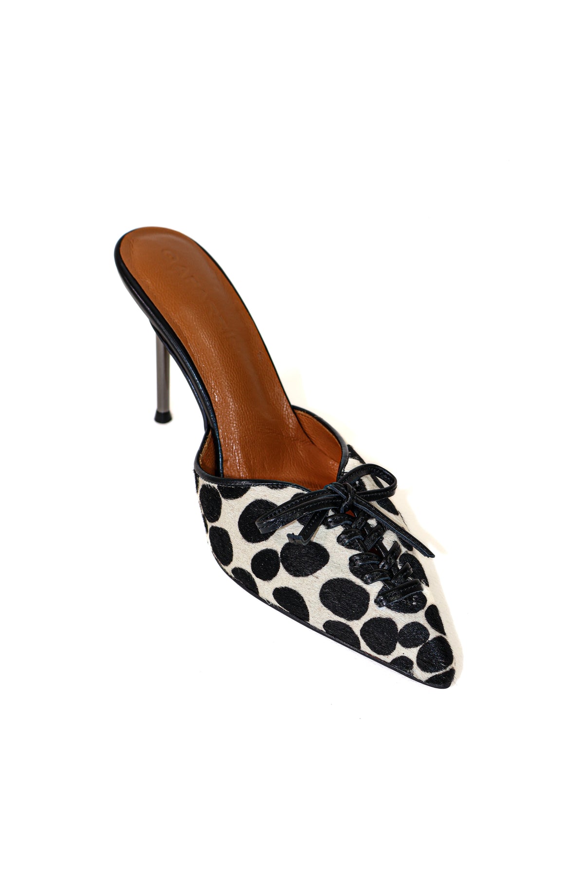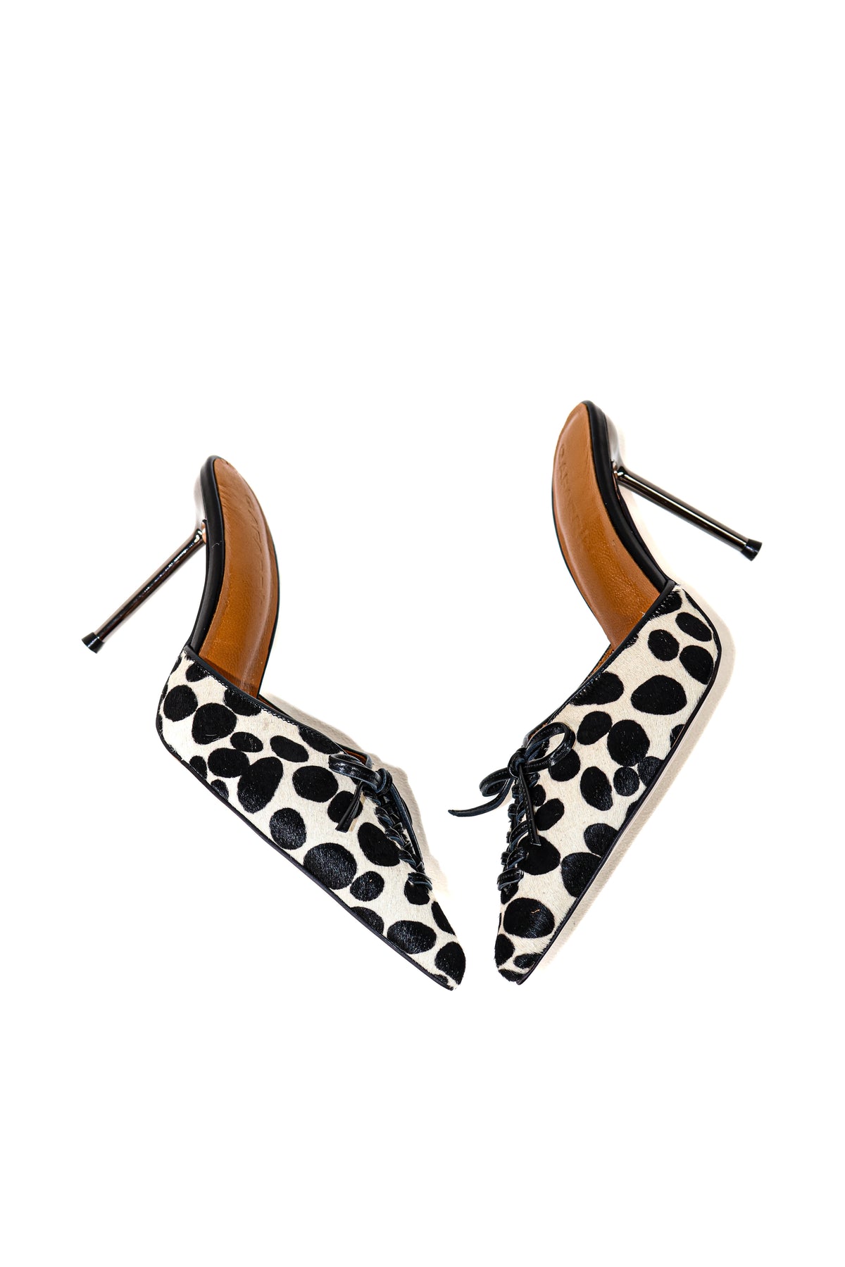 VIOLA DOT NOIR; ekru zemin üzerinde siyah benek desenli %100 doğal tay tüyü yüzeyi, çevresini saran prime cut siyah dana derisi kaplamalar ve deri bağcıklı burun paneliyle güçlü bir tasarım dili sunar.
