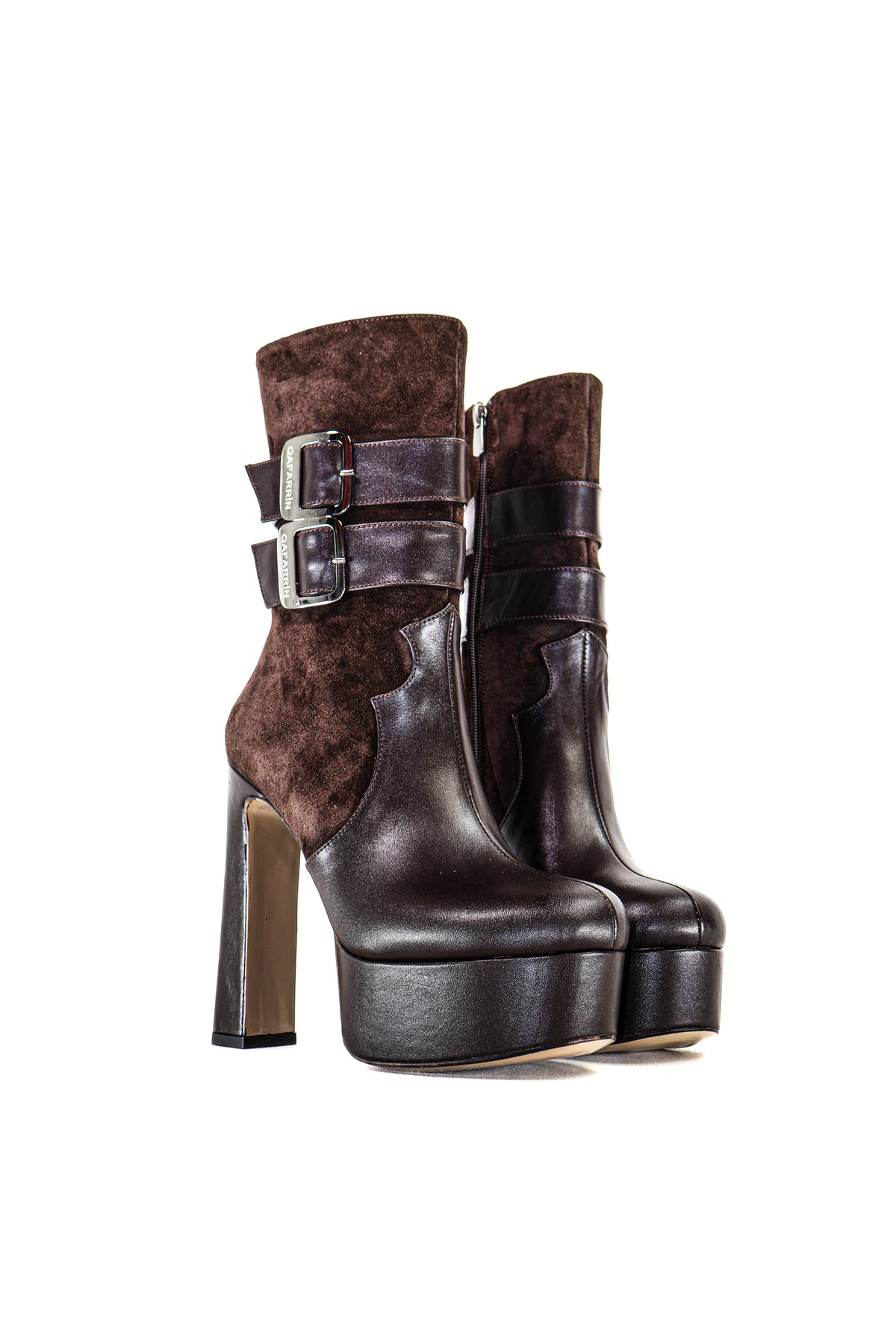 Kadifemsi süet ve parlak kahve prime-cut hakiki dana derisinin buluştuğu, 14 cm topuk ve 4 cm platformlu hem güç hem konfor sunan heykelsi bir couture bot.