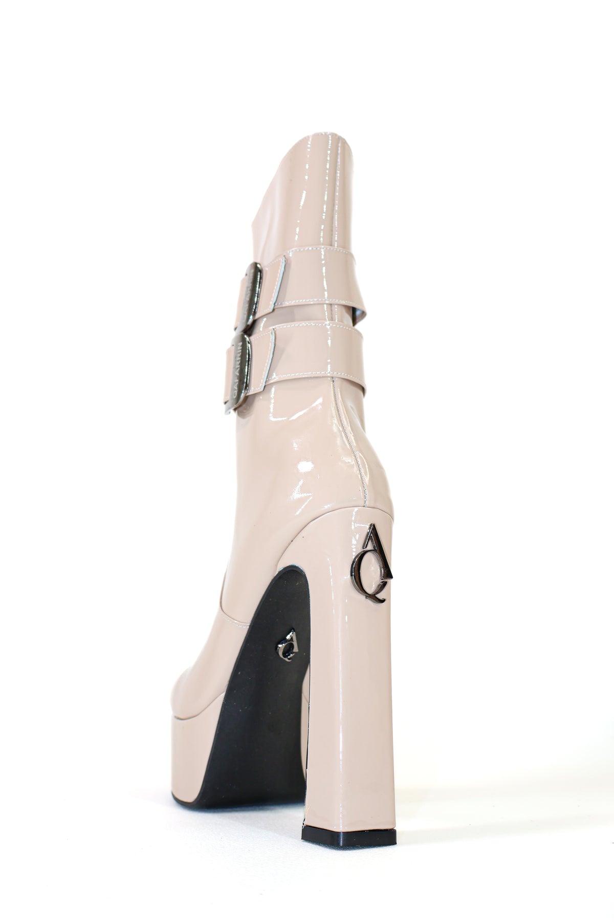 Krem rugan yüksek kaliteli hakiki dana derisi dış yüzey, keçi derisi iç astar, 14 cm topuk ve 4 cm platform ile güç ve konforu aynı bedende buluşturan, ışığı yumuşak ama iddialı şekilde yansıtan ikonik bir couture bot.