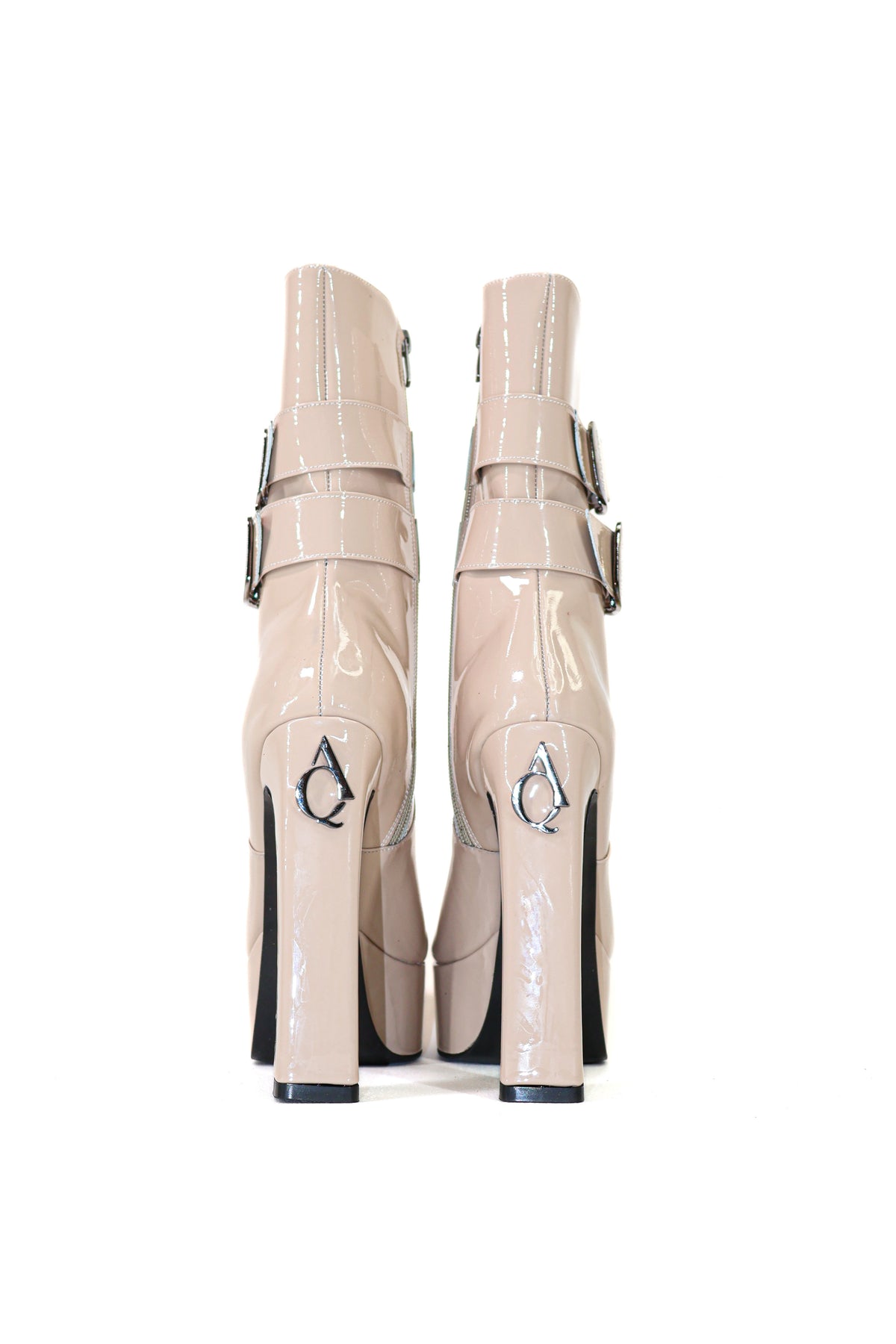 Aynalı parlaklıktaki krem rugan yüzey, ışığı yumuşak ama güçlü bir şekilde kırarken; çift metal toka ve yükseltilmiş platform, siluete hem modern güç hem de zarif bir feminen denge kazandırır. Bilek üstü oran, bacağı optik olarak uzatır; iç yandaki gizli fermuar ise kusursuz bir giy-çık kolaylığı sunar. Her detayı İstanbul atölyelerinde tek tek elde şekillendirilen bu model, Qafarrin’in “atelier-crafted” DNA’sını rafine ve sofistike bir ihtişamla taşır.